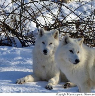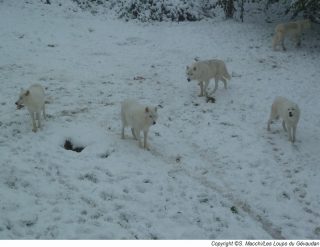 ❄️ Premières neiges de cette fin d’année au parc des Loups du Gévaudan, la meute des loups arctiques se réjouit.