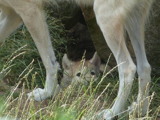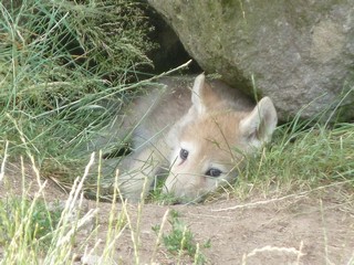 Nous nous approchons alors de la taniĂšre (photo ci-contre) dans laquelle nous avions repĂ©rĂ© Weeti la veille, et nous la retrouvons en compagnie de 2 louveteaux. đ€©